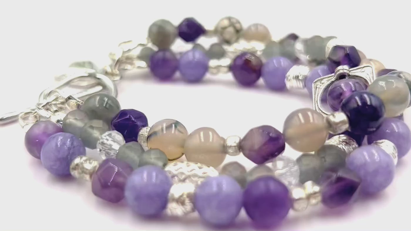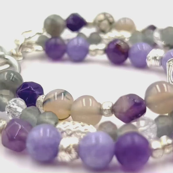 Introducing Amethyst Aria - Cradled in the earth’s embrace, the amethyst stone glows like a captured breath of twilight, its violet depths swirling with the muted hues of dusk—lavender mist, indigo shadow, and the soft purr of starlight. Three gracefully interwoven strands unite genuine Amethyst and Agate stones with luminous artisan glass beads, creating a harmonious interplay of deep purples, soft greys, and charcoal blacks. Polished silver-toned accents and a refined toggle clasp complete this design with quiet sophistication.