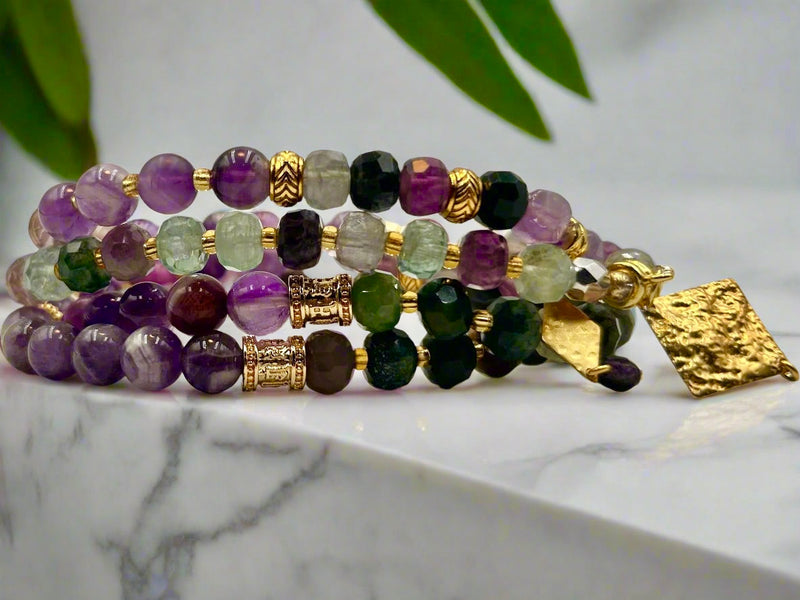 Elevate your style with the Amethyst Dewdrop, a breathtaking 3-way necklace and bracelet combo that effortlessly blends versatility with timeless elegance. Handcrafted with 8mm semi-precious amethyst and agate stones, this piece showcases a mesmerizing blend of lush purples and soft misty greens, accented with delicate gold-toned detailing. More than just an accessory, it’s a celebration of individuality and mindful beauty. Amethyst, known for its calming energy and spiritual clarity, harmonizes with agate’s grounding properties—making this piece as meaningful as it is stunning.