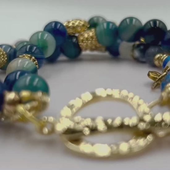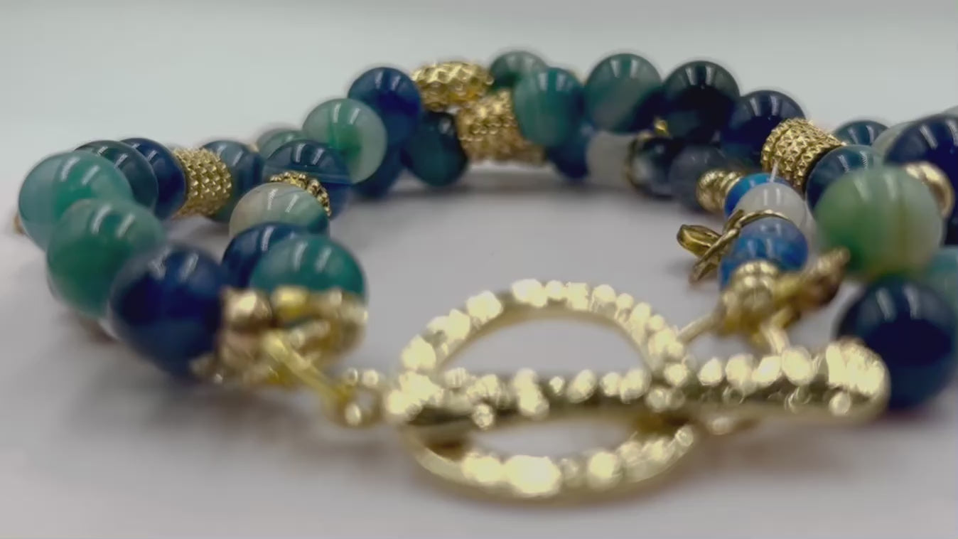 Embrace the serene elegance of Blue Rhapsody, where three gracefully interwoven strands unite Blue Band Agate, Sodalite, and Imperial Blue Jasper in a symphony of cobalt and sapphire tones. Warm gold accents dance across the patterned stones, creating refined contrast and visual depth. Meticulously hand-assembled with approximately 50 carefully curated beads in 6mm and 8mm sizes, this 7.5-inch bracelet concludes with polished gold toned details and a sophisticated toggle clasp. Each stone carries symbolism from anncient times—Agate is known for stability and balance, Sodalite awakens intuition and tranquility, while Imperial Blue Jasper promotes courage and clarity. A distinguished piece for those who treasure jewelry infused with both aesthetic sophistication and symbolism.