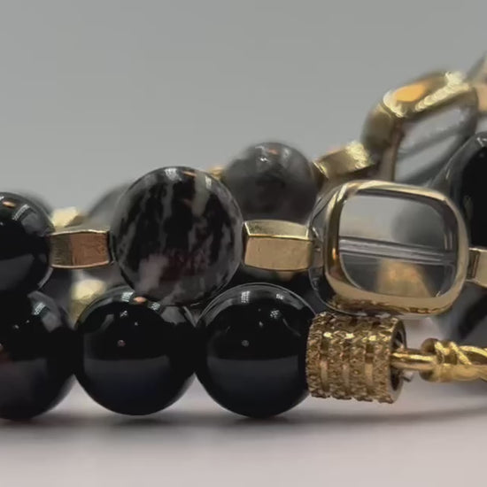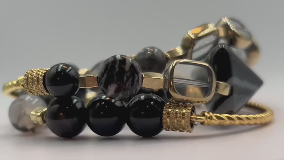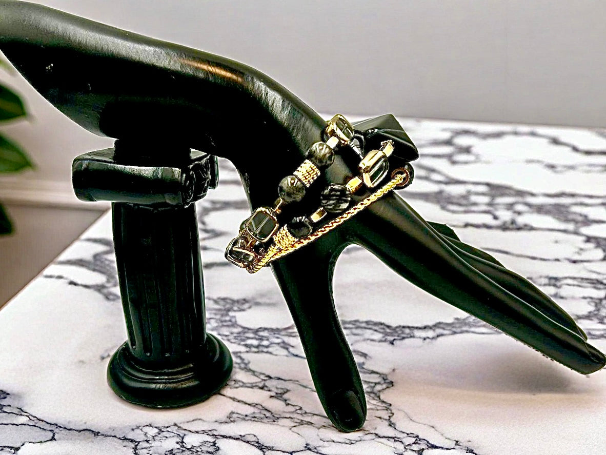 Experience the sophistication of this unique three-piece bracelet set, where bold design meets classic charm. The centerpiece showcases a large rectangular Black Agate Stone, renowned for its grounding and protective qualities, with striking grey geometric patterns for a modern edge. Complementing it are carefully selected beads of Dragons Vein Agate, known for its intricate black-and-white web-like veining that symbolizes creativity and resilience; Silkstone Jasper, featuring captivating layered stripes that inspire balance; and Grey Larvikite, valued for promoting clarity and intuition. Accented by rectangular clear glass beads framed in warm gold tones, this set radiates understated elegance and depth.