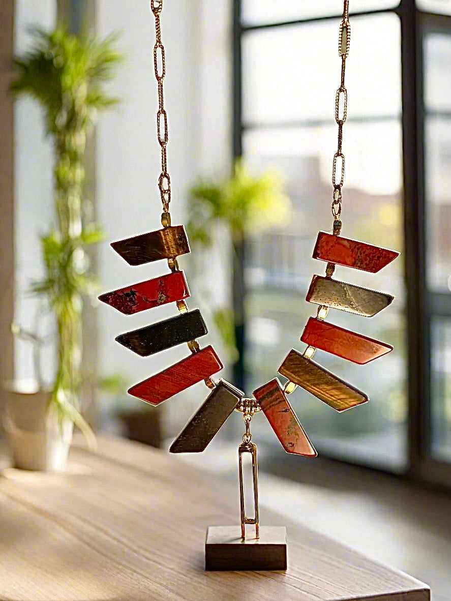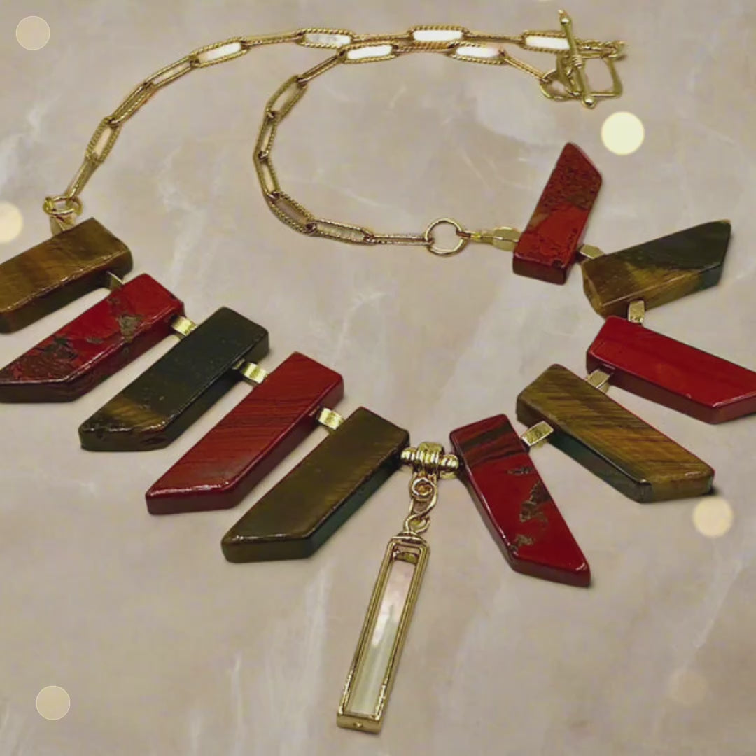 Embrace the art of elegance with our 'Empress' necklace – a captivating testament to natural beauty, and undeniable style. This 18-inch collar necklace is an exquisite mosaic of earth's treasures. Gaze upon the deep, lustrous currents of Tiger's Eye, its silky gold hues whispering tales of unwavering courage and sharp intuition. Let your eyes drift to the rich, fiery depths of Red Jasper, igniting a fervent spark of passion and unyielding strength.