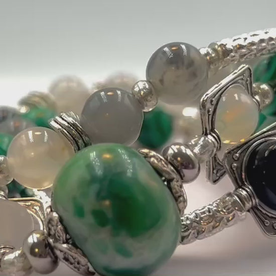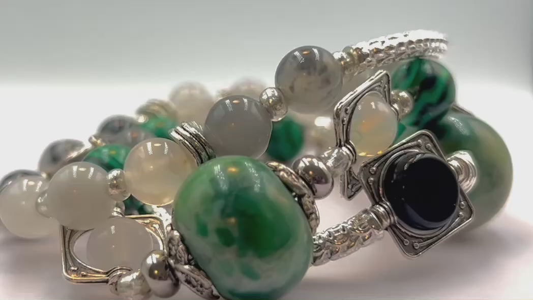 Embrace the quiet strength of “Forest Noir” a contemporary three-piece bracelet set designed for those who appreciate bold beauty with a touch of meaning. Each bracelet is crafted with semi-precious stones in a captivating palette of deep greens, blacks, and whites. Rich Malachite Stones reveal their naturally dramatic green-and-black stripes, complemented by commanding depth of 20mm Green Jasper focal stones that bring grounding energy and strength. Black onyx and agate add contrast while symbolizing protection and balance, and silver-toned accents provide a polished, modern finish.