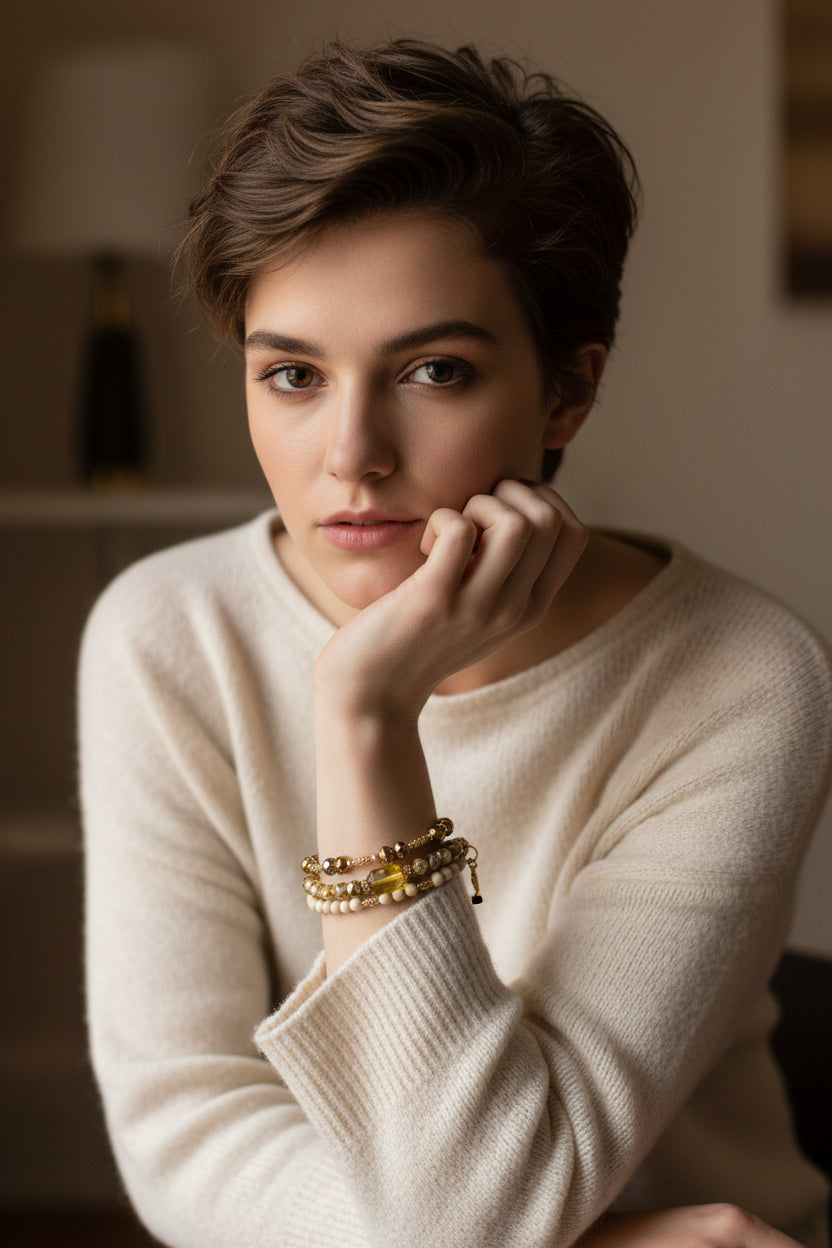 Crafted with approximately 50 beads in 8mm and 6mm sizes, this 7.5" bracelet drapes gracefully on most wrists—a grounding yet sophisticated statement piece for those seeking understated luxury with purposeful style.