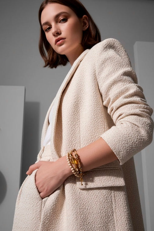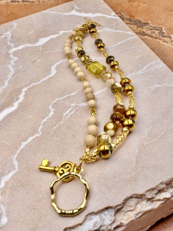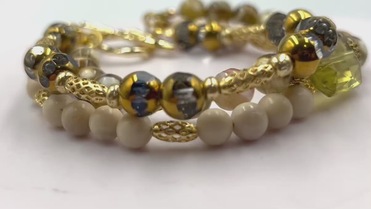 Discover the Glowing Ember bracelet, where natural beauty meets refined elegance. This three-strand design harmonizes fire-crackled Agate Stones for balance and strength with creamy Fossil Stone's ancient wisdom, accented by shimmering artisan glass beads. Gold-toned details and a decorative toggle clasp elevate the composition, while earthy tones and luminous shimmer create a captivating contrast.