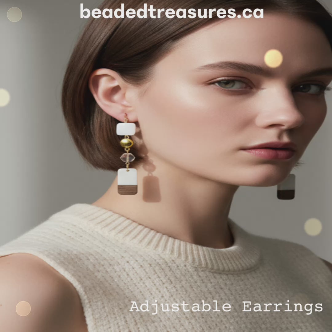 Transform your look with Guilded Ivory—adjustable earrings that bridge modern elegance and versatility. These sophisticated pieces combine translucent freshwater shell beads in sleek square tablets with artisan rectangular accents featuring cream and wood block patterns, all enhanced by lustrous gold-tone details. The ingenious magnetic center mechanism unlocks two distinct lengths, allowing you to shift effortlessly between refined daytime styling and graceful evening occasions.