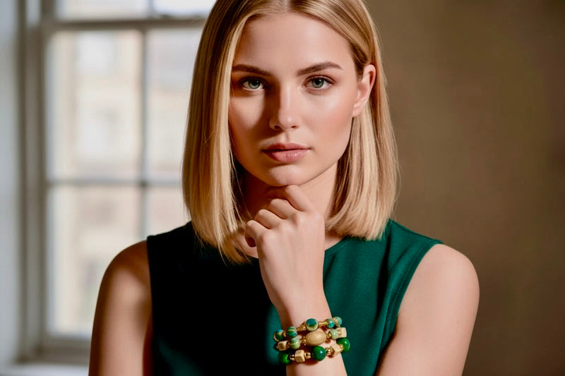Embrace the current styling trend of chunky silhouettes with our Jasper Tide 3-piece stackable bracelet set - an exclusive design for those who crave unique and eye-catching accessories. This one-of-a-kind piece features bold 14mm green Jasper stones, carefully paired with an eclectic assortment of glazed pottery artisan beads in soft, misty hues of blues, greens and sandy shades. The layered combination of round and cube shapes creates an engaging design, with the natural hues of Jasper harmonizing elegantly with the ceramic elements.