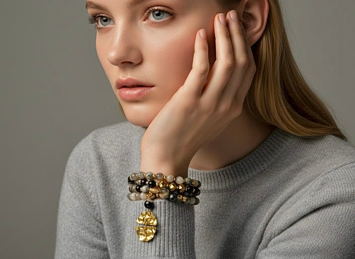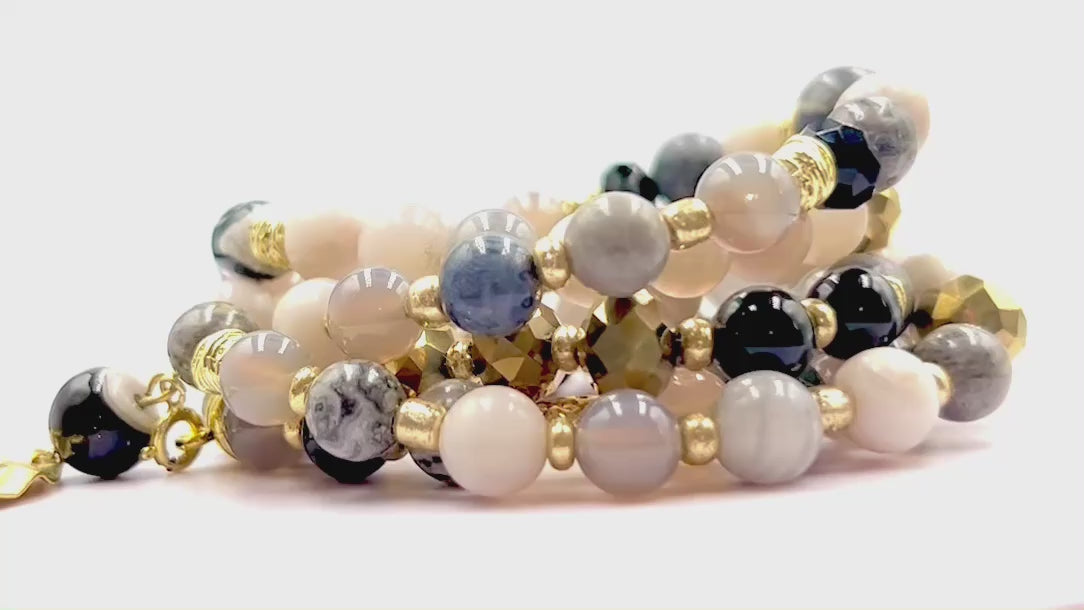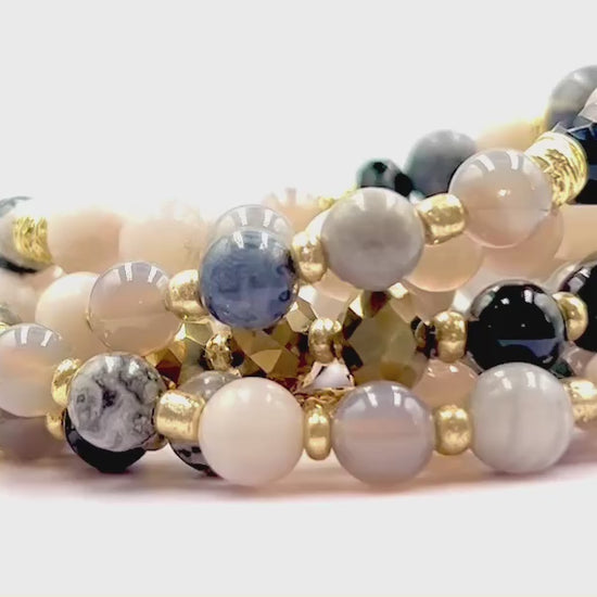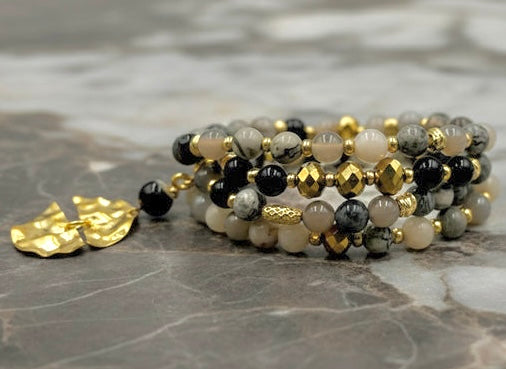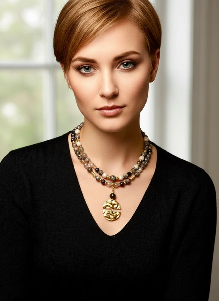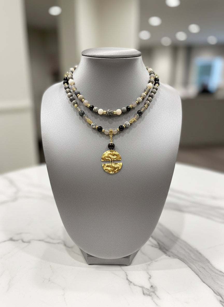 The Luna’s Embrace necklace is a celebration of moon, earth and elegance, crafted with over 80+ semi-precious treasures. Soothing Grey Map Jasper invites tranquility and focus, while grounding Bamboo Agate stones nurture inner stability. Deep, protective Black Onyx symbolizes strength and resilience, all brought together with luminous gold-tone accents and a hand-hammered split-moon pendant—symbolizing unity and wholeness.