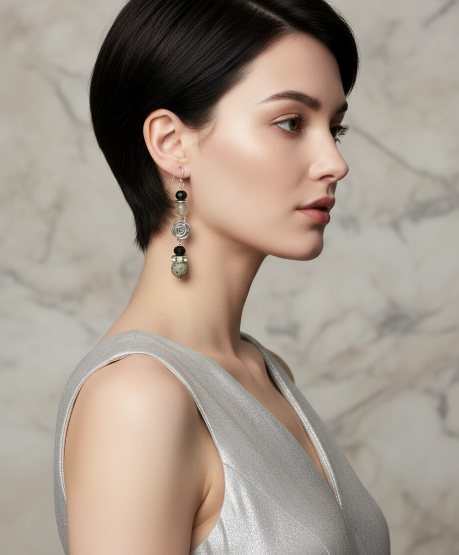 Elevate your style with the Map Jasper Adjustable Earrings, featuring semi-precious Jasper and Grey Agate stones set against elegant silver-toned details. Their sophisticated design incorporates a subtle magnetic bead, allowing seamless adjustment between two lengths for easy transitions from daytime refinement to evening allure. This versatile accessory offers timeless grace for any occasion.