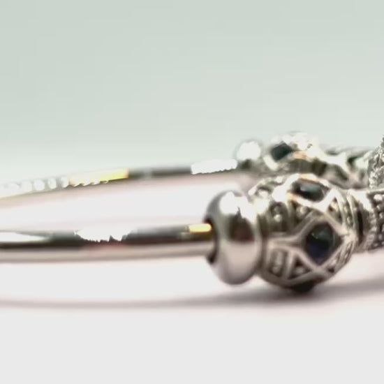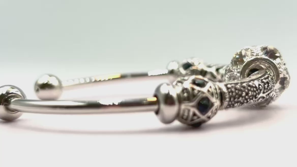 Midnight - Beaded Bangle is a luminous expression of elegance that captures both the light and the imagination. This polished silver-toned cuff showcases a striking 20mm focal bead, shimmering with white crystal rhinestones that create a captivating play of brilliance. Intricate silver-toned accents add rich texture and dimension, while two 10mm end beads, each set with deep black onyx crystals, offer a refined contrast and subtle sparkle.
