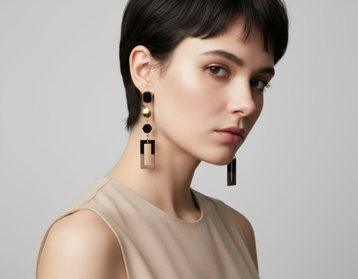 Onyx Echo earrings embody refined versatility and contemporary design. Sleek black onyx octagons harmonize with artisan rectangular accents, unified by warm gold-tone detailing that catches the light with subtle brilliance. The magnetic adjustment mechanism reveals two distinct lengths, allowing you to shift your aesthetic from understated daytime elegance to graceful evening sophistication.