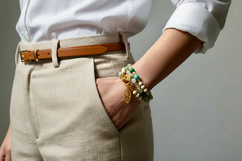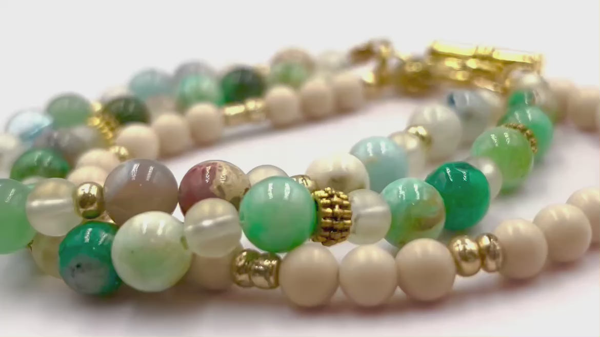 Step into timeless elegance with the Prelude Multi-Strand Bracelet—a harmonious fusion of nature’s artistry and mindful craftsmanship. Three delicate strands intertwine to form a soft, misty watercolor effect, blending soothing bluish green shades Chalcedony stones with warm ivory Fossil stones. Revered since ancient times, Chalcedony symbolizes calm energy and balance, while Fossil stones embody ancestral wisdom and the enduring flow of life. Glimmers of warm gold toned accents trace across the patterned beads, enhancing the design with radiant depth and refined movement.