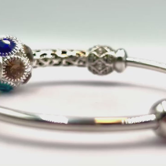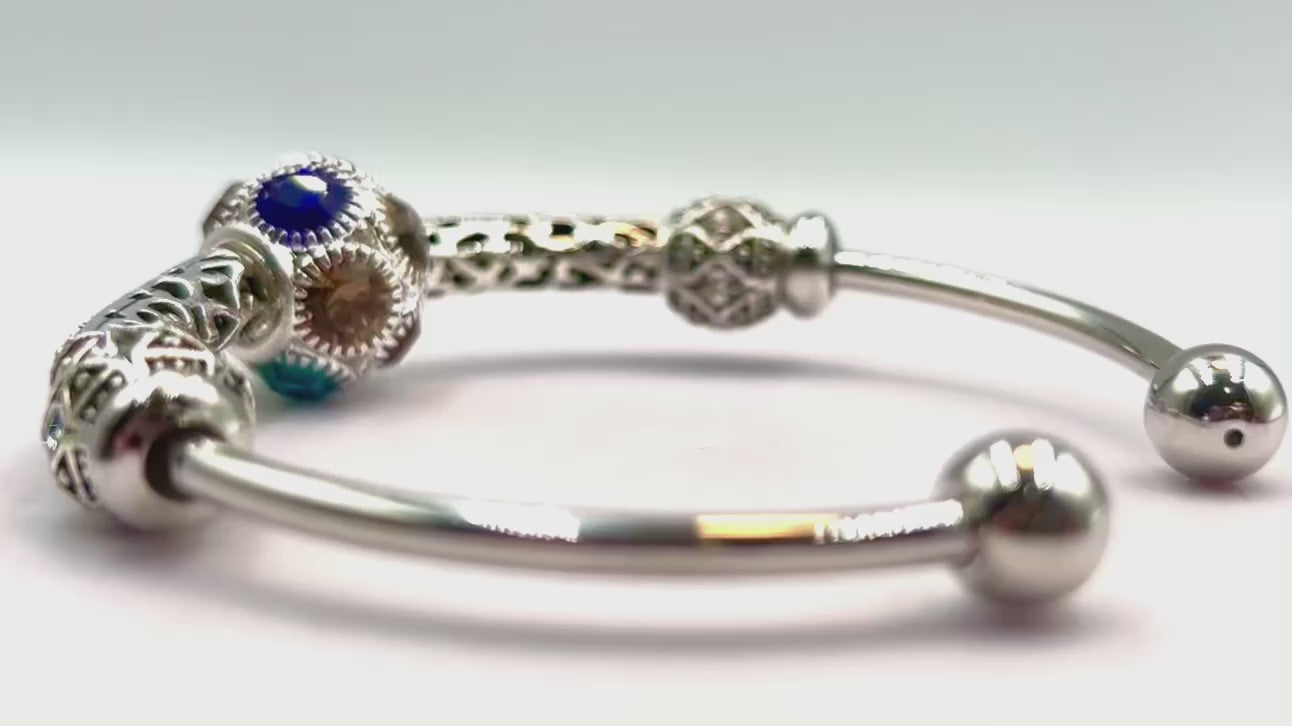 Graceful, radiant, and timeless — Prism is a luminous expression of elegance that catches the light and the imagination. This polished silver-toned cuff features a striking 20mm focal bead adorned with a spectrum of colorful crystal rhinestones, each hue carefully chosen to complement the next in perfect harmony. Decorative silver-toned accents add depth and texture, while two 10mm end beads, delicately embedded with white crystals, complete the design with a refined sparkle.