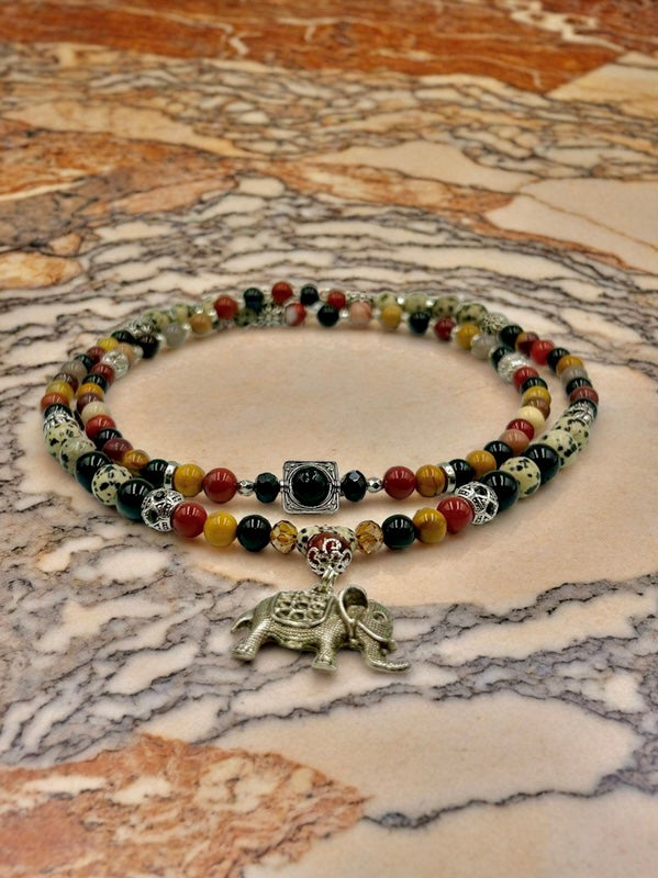 This stylish 36-inch stretch necklace, is crowned with a majestic elephant pendant, and capable of transforming effortlessly from a classic single strand to a layered double wrap or statement wrist piece. The clasp-free design ensures a seamless, effortless style, as the wearer embodies the natural beauty that Savanna Serenade so effortlessly evokes.