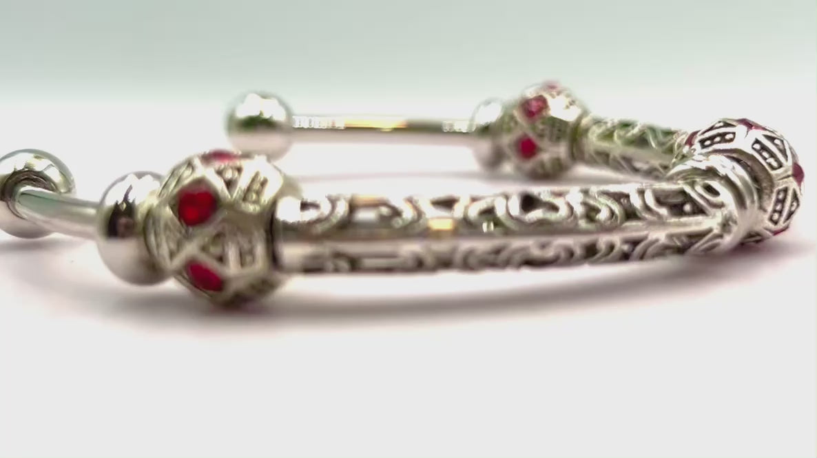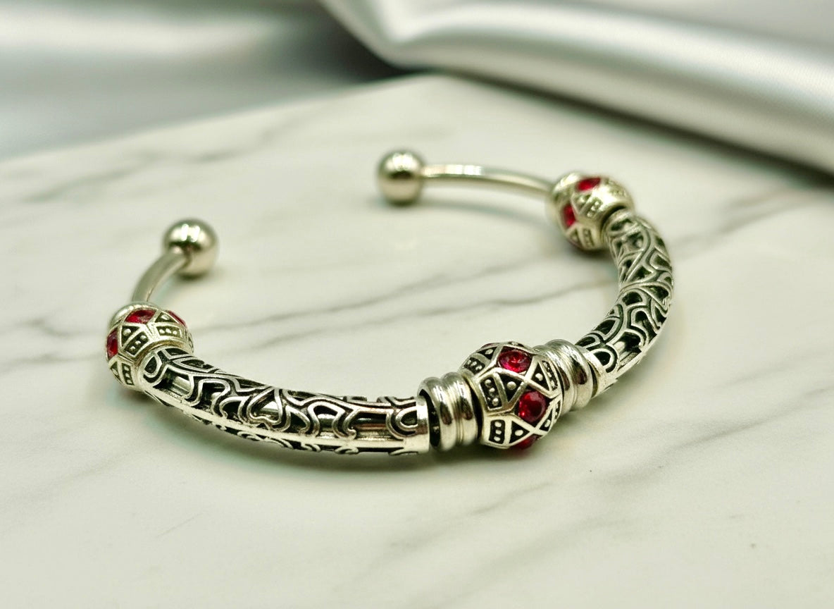Meet Scarlet — The Elegant Beaded Cuff Bangle. Graceful, radiant, and undeniably timeless, Scarlet captures the essence of modern sophistication with a touch of vintage romance. This polished silver-toned cuff showcases three 10mm decorative beads, each beautifully set with ruby red crystal rhinestones that shimmer with every movement. Delicate silver-toned detailing frames each bead, adding depth and texture to its captivating design.