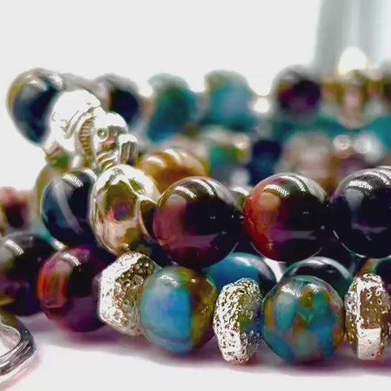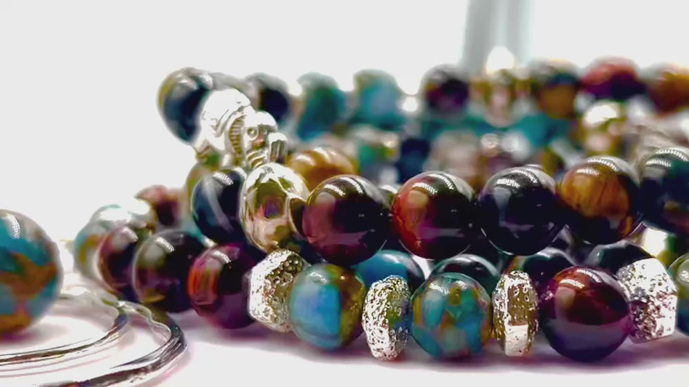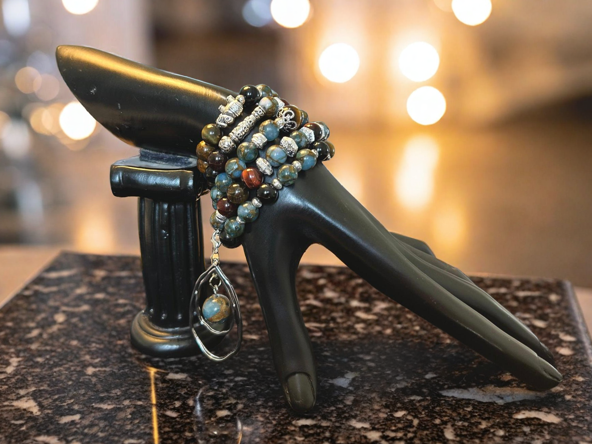 Bask in the iridescent glow of “Silken Sands”, a stunning design that harmonizes a collection of semi Precious stones in deep shimmering tones that shift in the light. At its heart lie sumptuous Tiger’s Eye stones in three distinct moods: classic golden hues for confidence, ultra‑deep Hawk‑Blue for visionary insight, and rich burgundy for passionate grounding. This palette is perfectly complemented by blue Cloisonné Jasper Stones, reminiscent of a deep tranquil waters —stone of intuitive clarity. Interspersed among these gems are silver‑plated Lava Rock stones, symbols of inner fire and transformation, that catch the light with a subtle metallic gleam.
