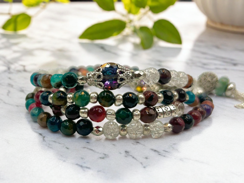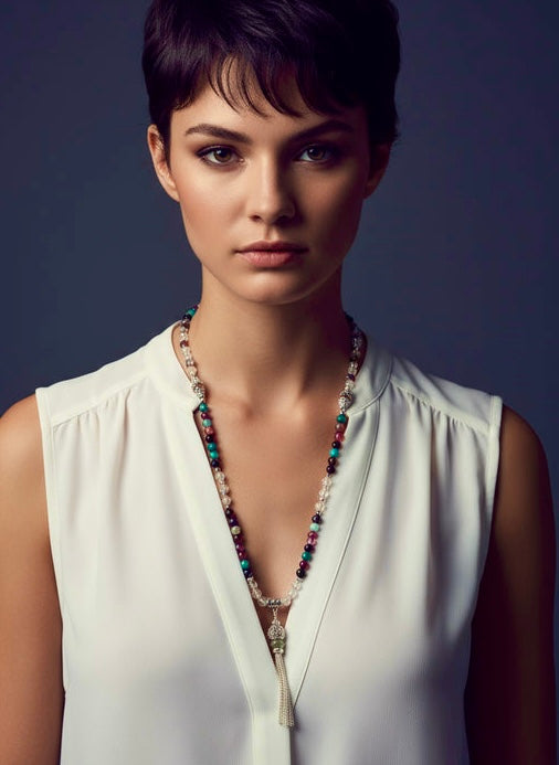 Introducing Wine Flower, the ultimate in versatility and elegance, where jewelry meets art. This stylish accessory seamlessly transforms from a breathtaking necklace to a chic bracelet, effortlessly elevating any outfit. Comprised of an array of 6mm faceted Agate stones in luscious berry tones, paired with cultured crystal accent beads and silver-toned accents. At its center lies a stunning Jasper pendant, complemented by a silver-toned chain tassel, infusing the piece with a deep sense of natural beauty and symbolism. Jasper, known for its grounding properties and connection to the earth, is said to promote stability and balance, making Wine Flower not just a stylish addition, but a meaningful one.